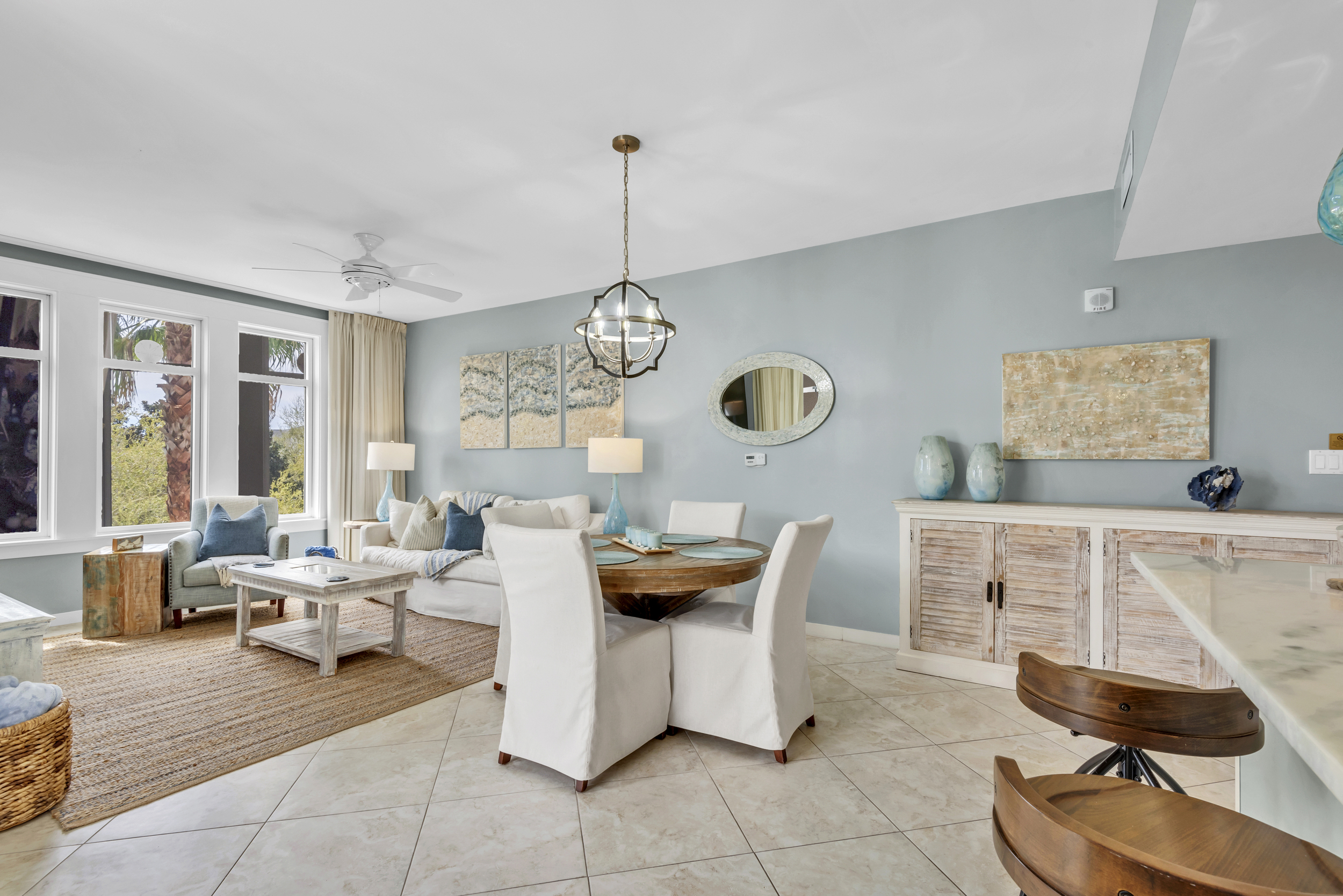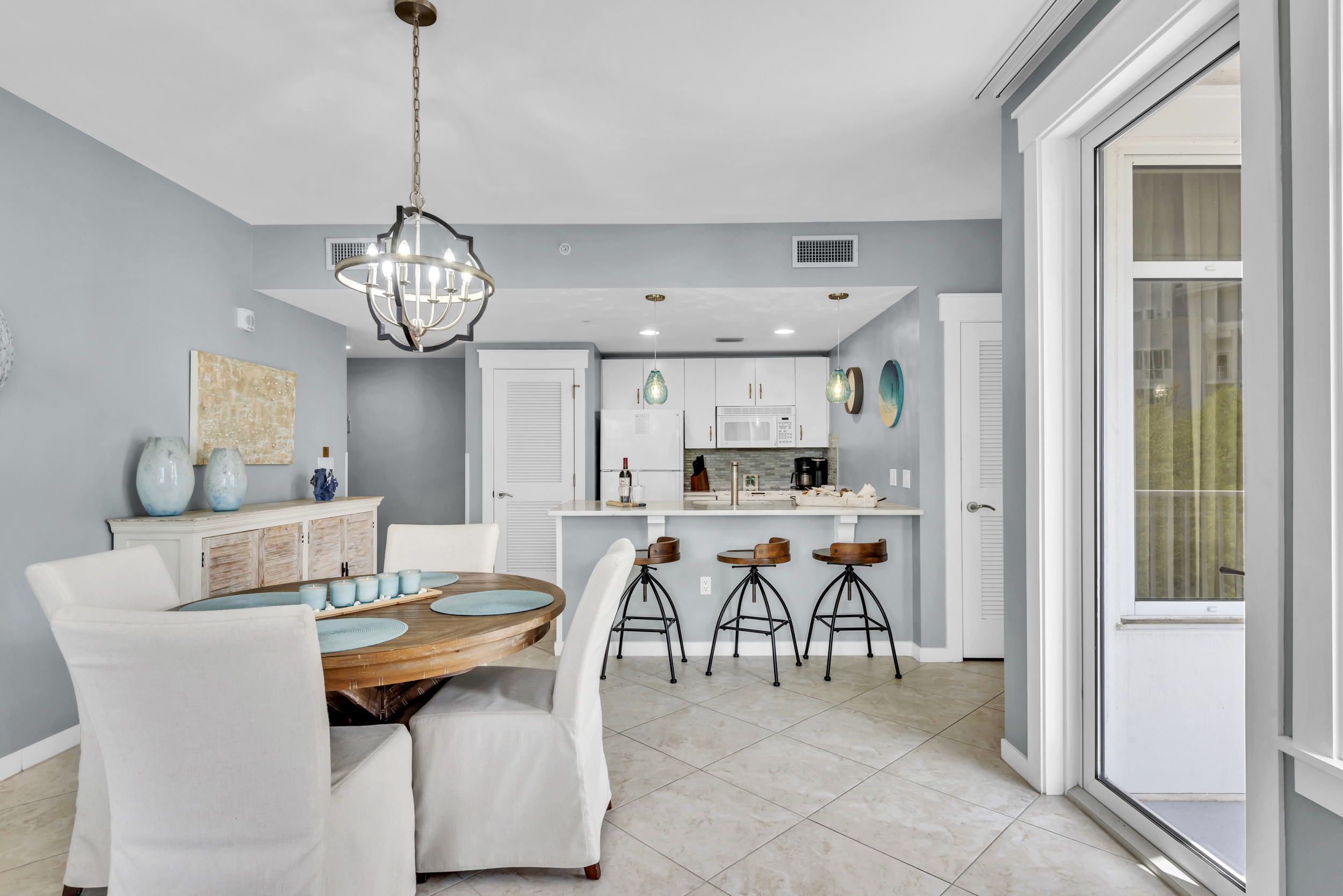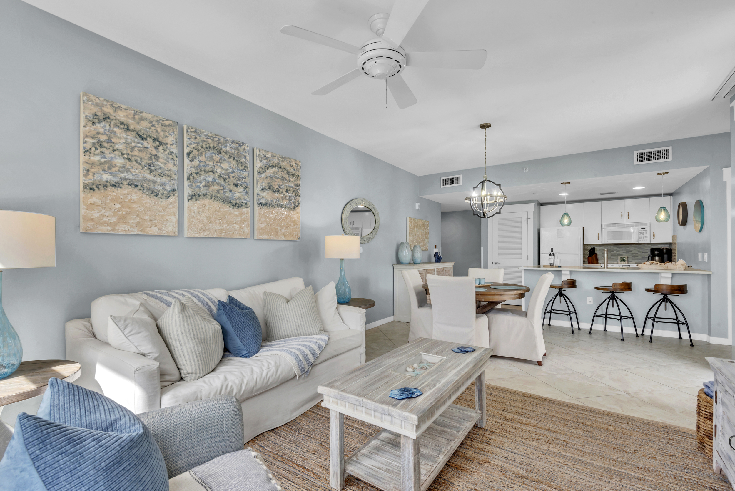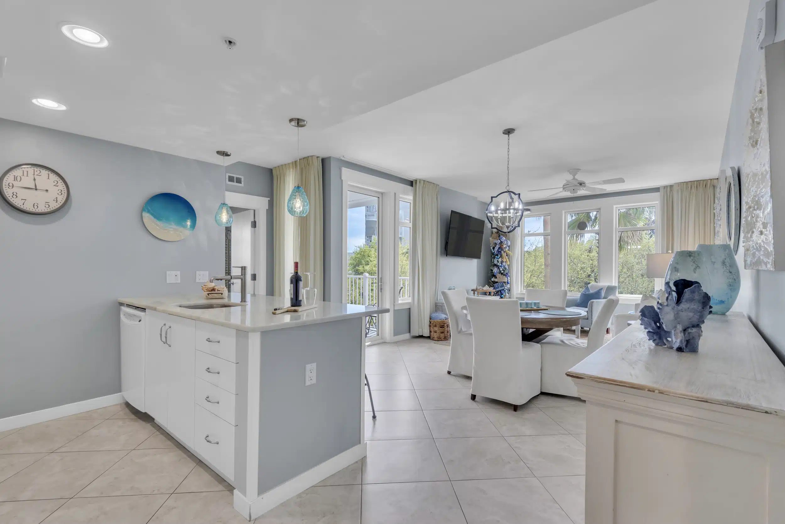 The SeaBlue condo in Elations is beautiful, bright, and classic— and bathed in sandy neutrals and calming blues that reflect the soothing coastal location. A comfy sofa— which is also a pull-out bed— and armchair face a large flatscreen television and create a perfect space to curl up with your favorite TV show or a great movie. Large windows allow the dappled Florida sunshine to pour in and frame the views of the swaying palm trees.