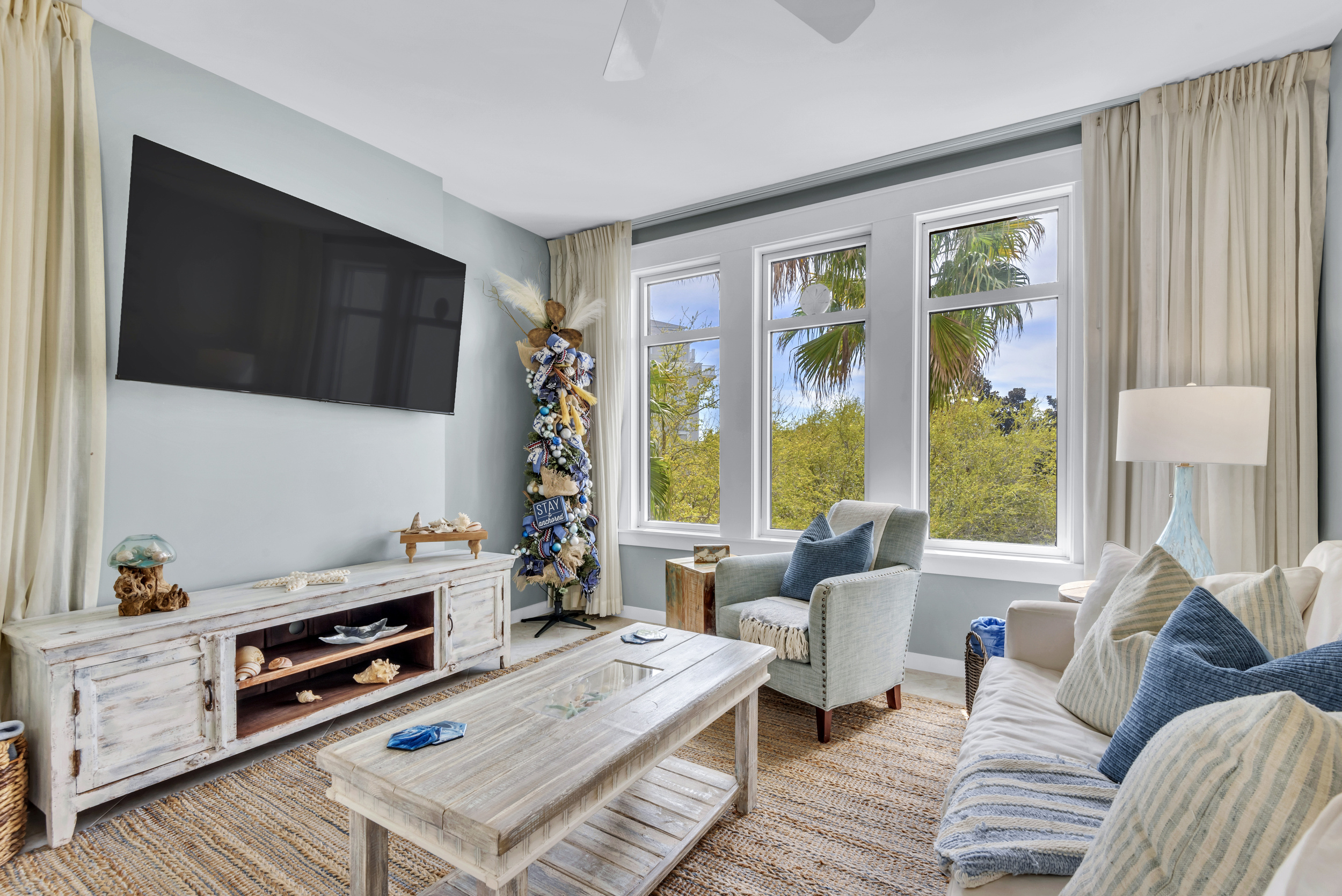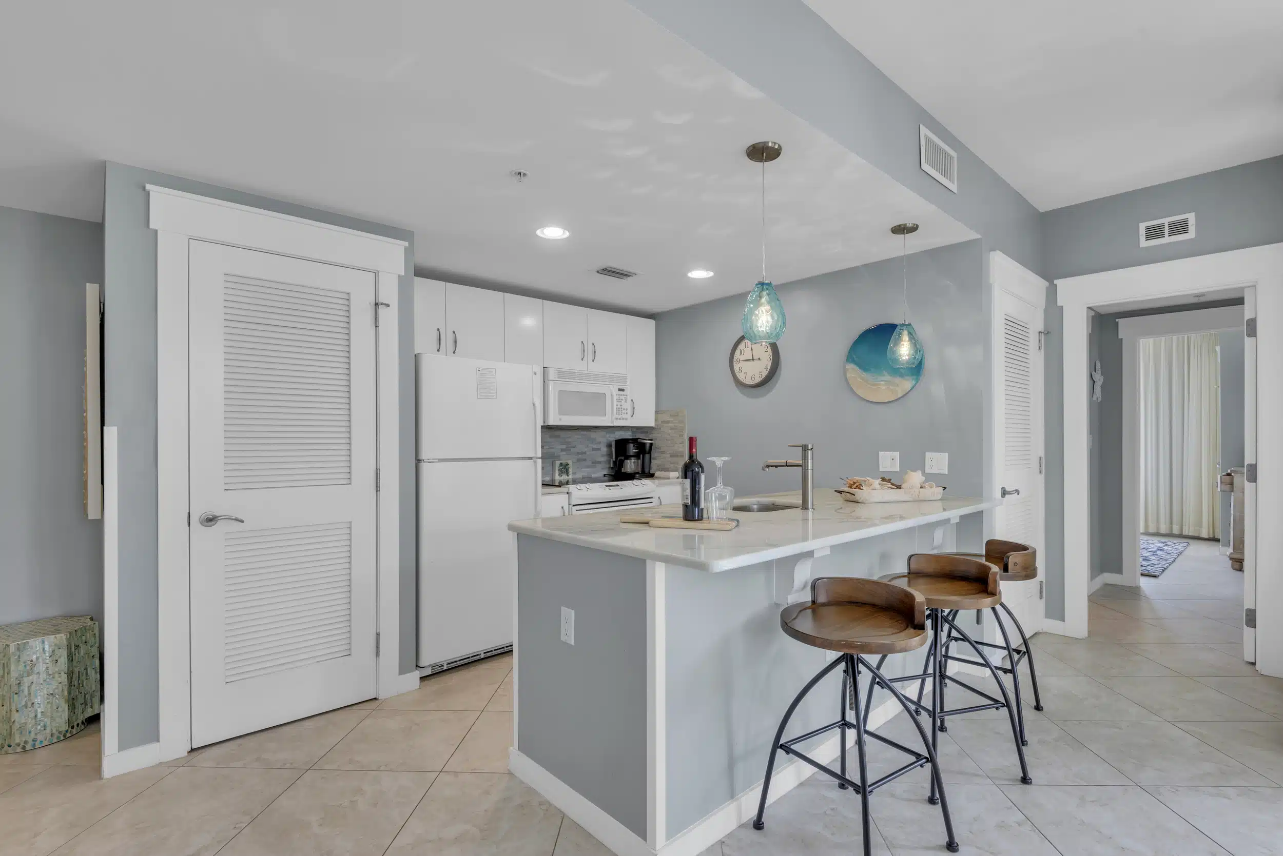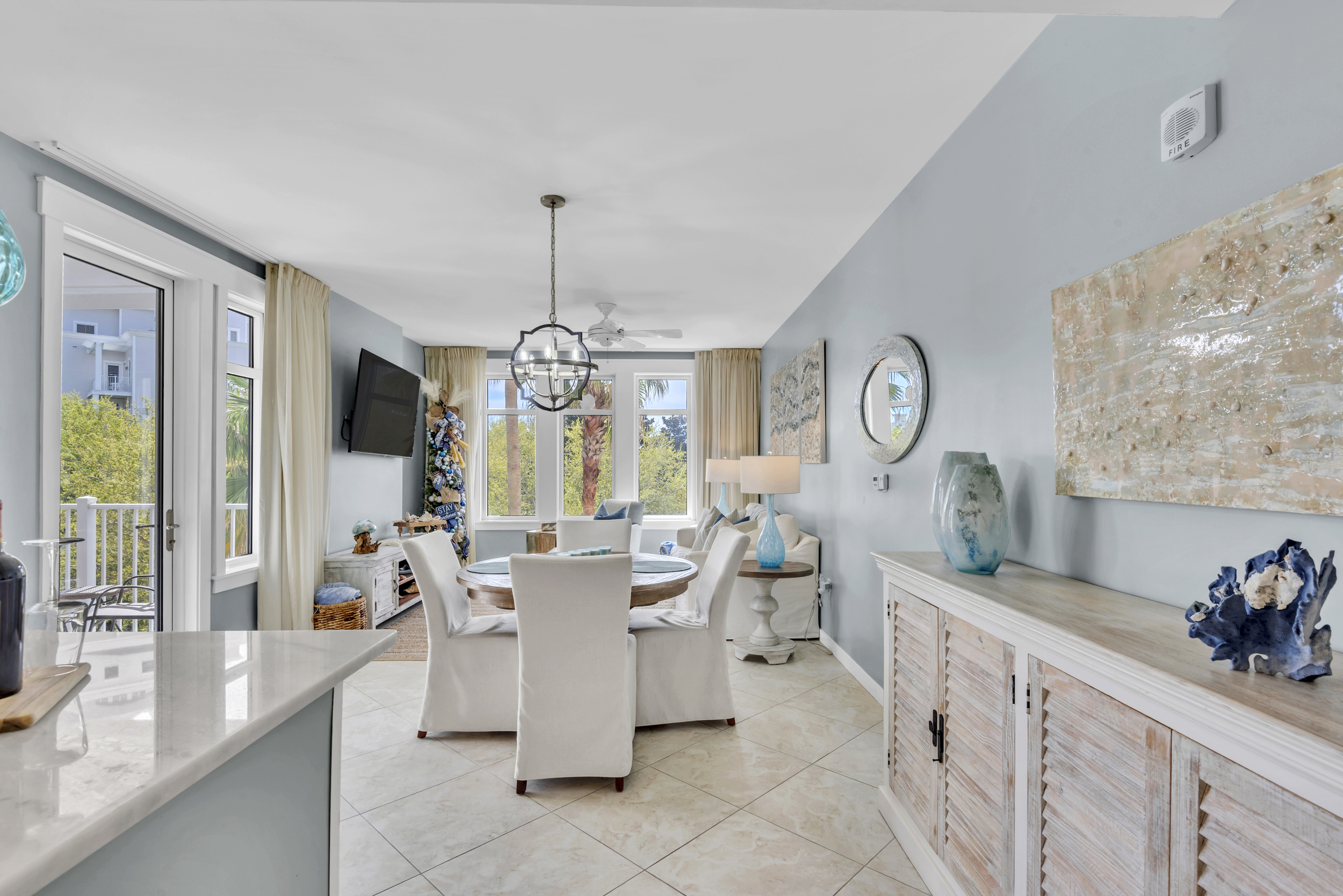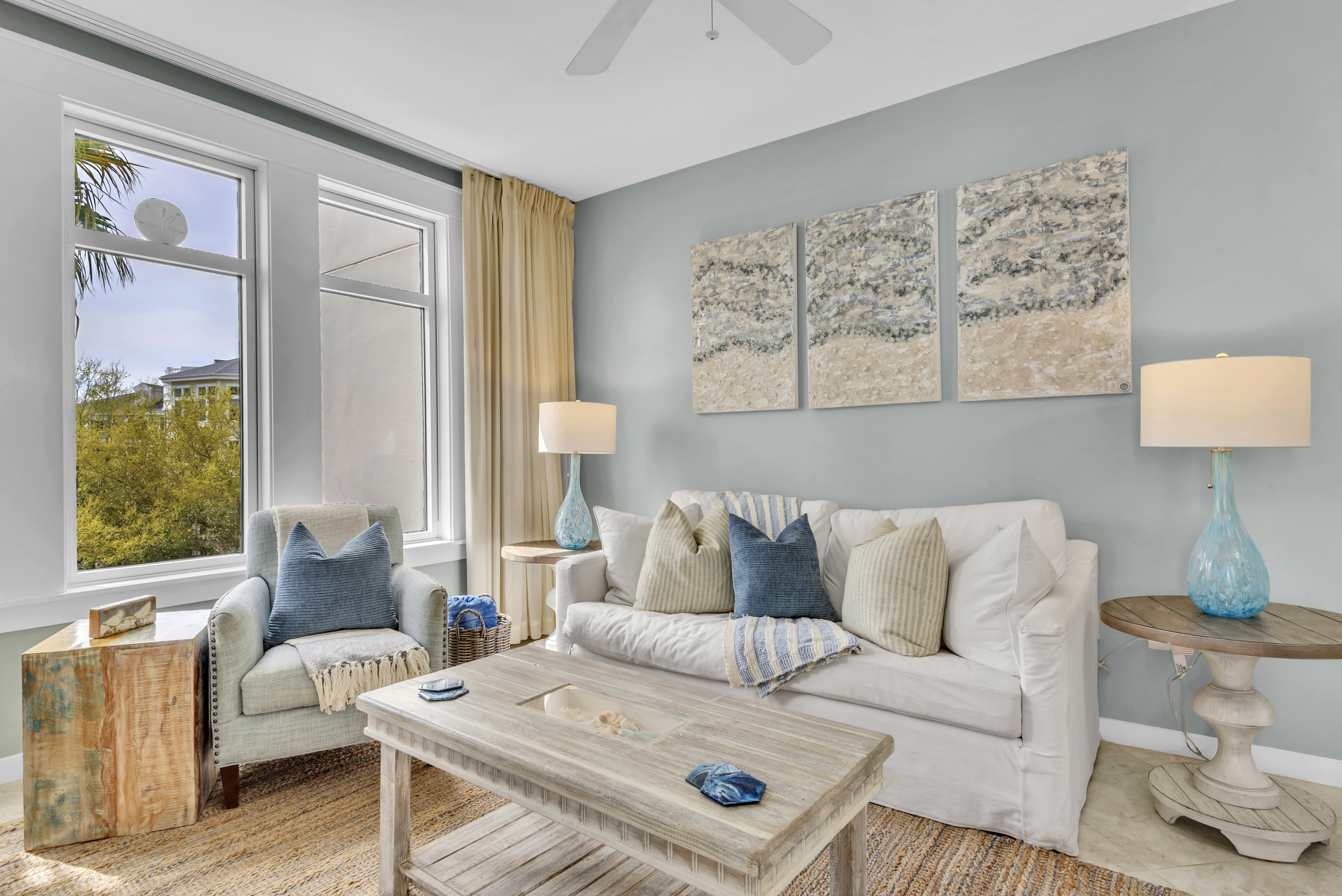 The SeaBlue condo in Elations is beautiful, bright, and classic— and bathed in sandy neutrals and calming blues that reflect the soothing coastal location. A comfy sofa— which is also a pull-out bed— and armchair face a large flatscreen television and create a perfect space to curl up with your favorite TV show or a great movie. Large windows allow the dappled Florida sunshine to pour in and frame the views of the swaying palm trees.