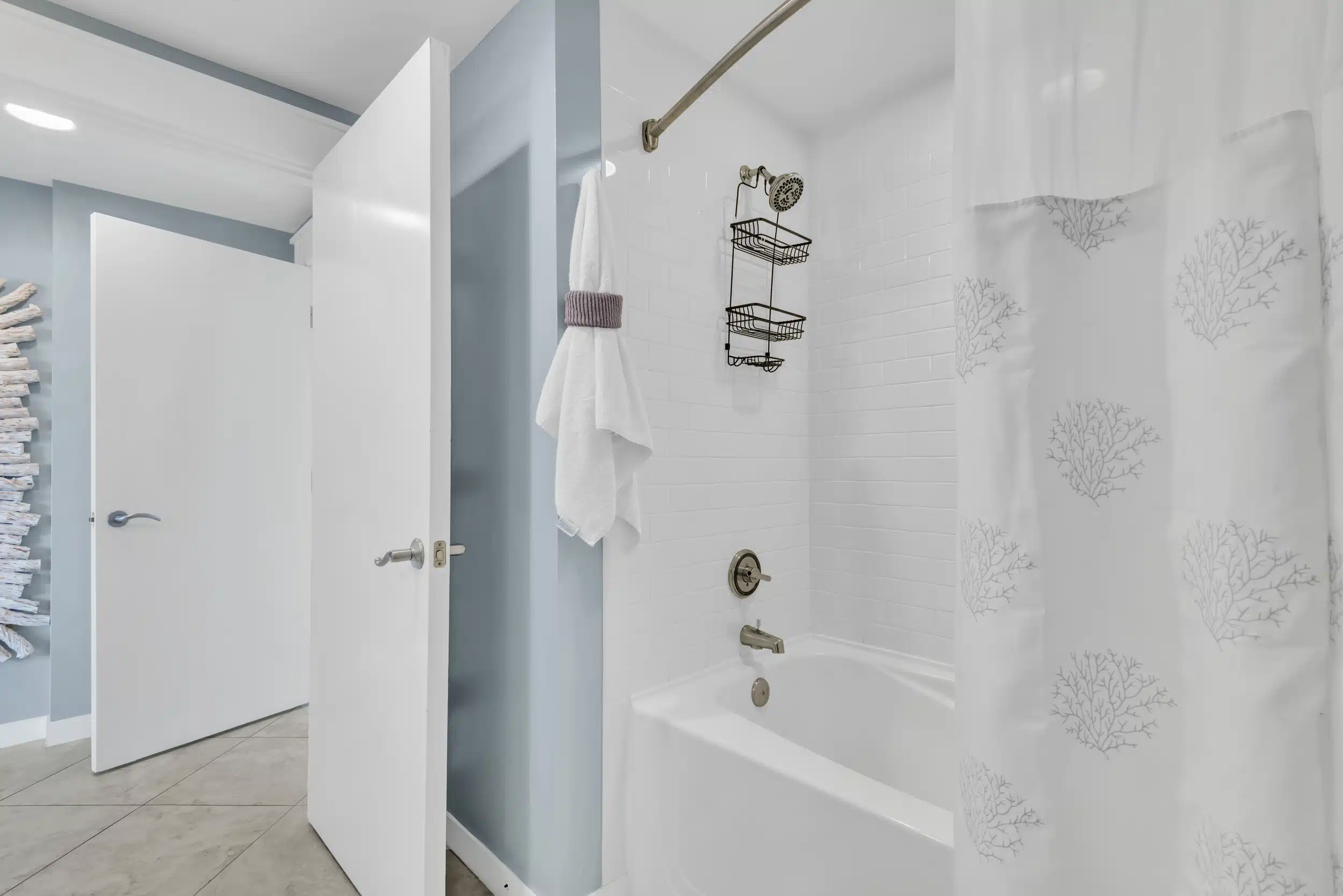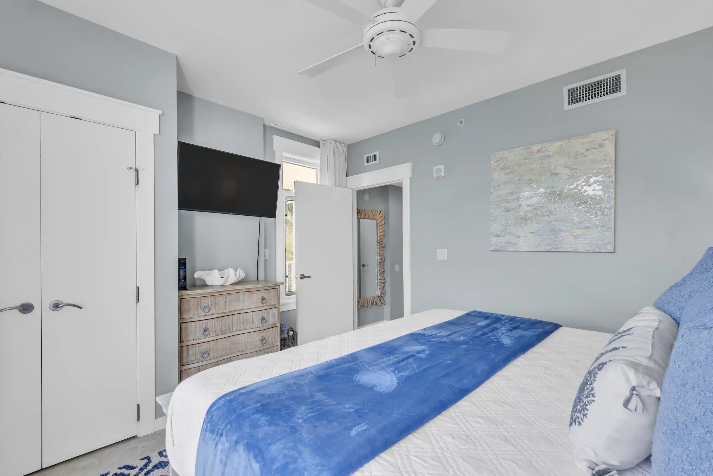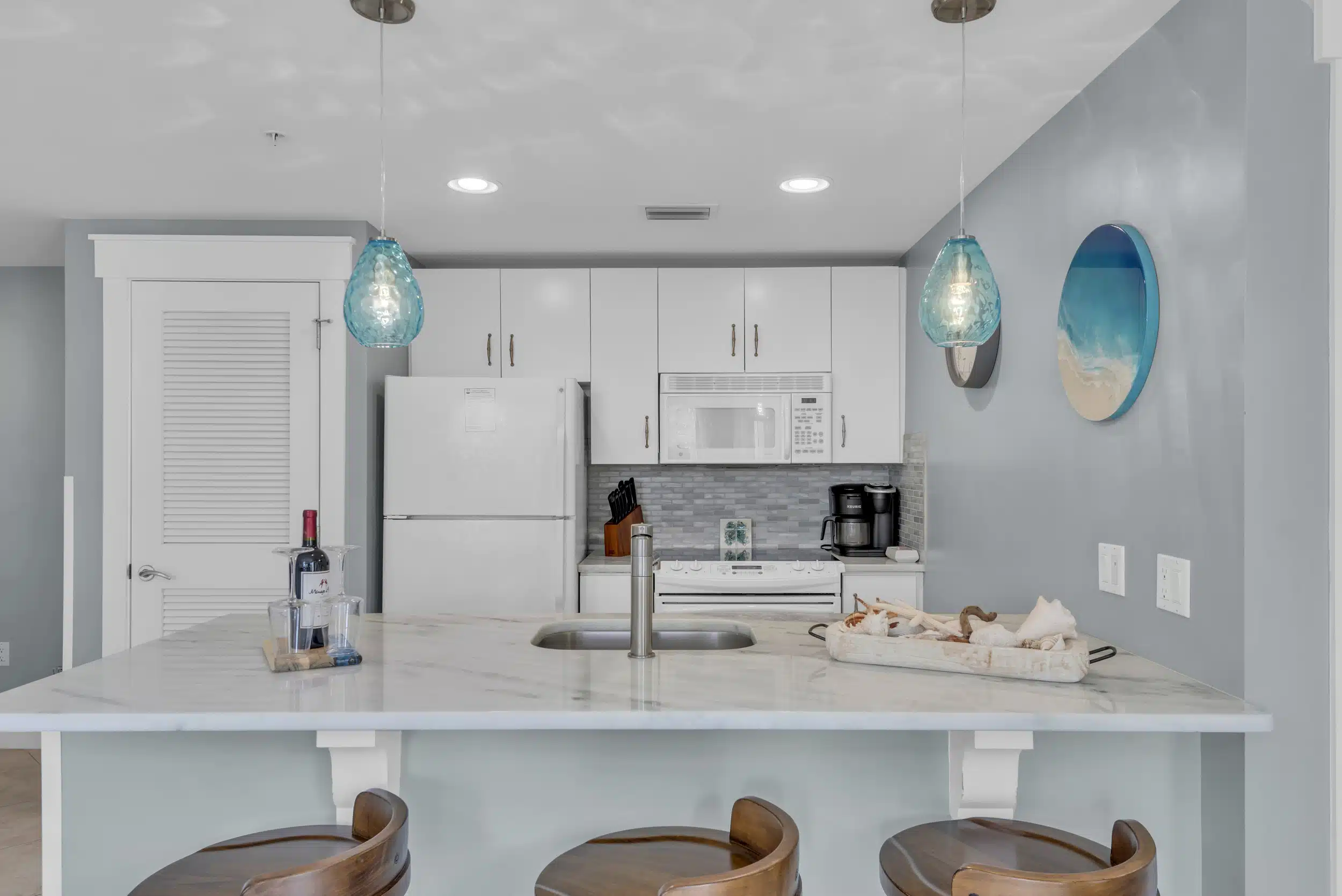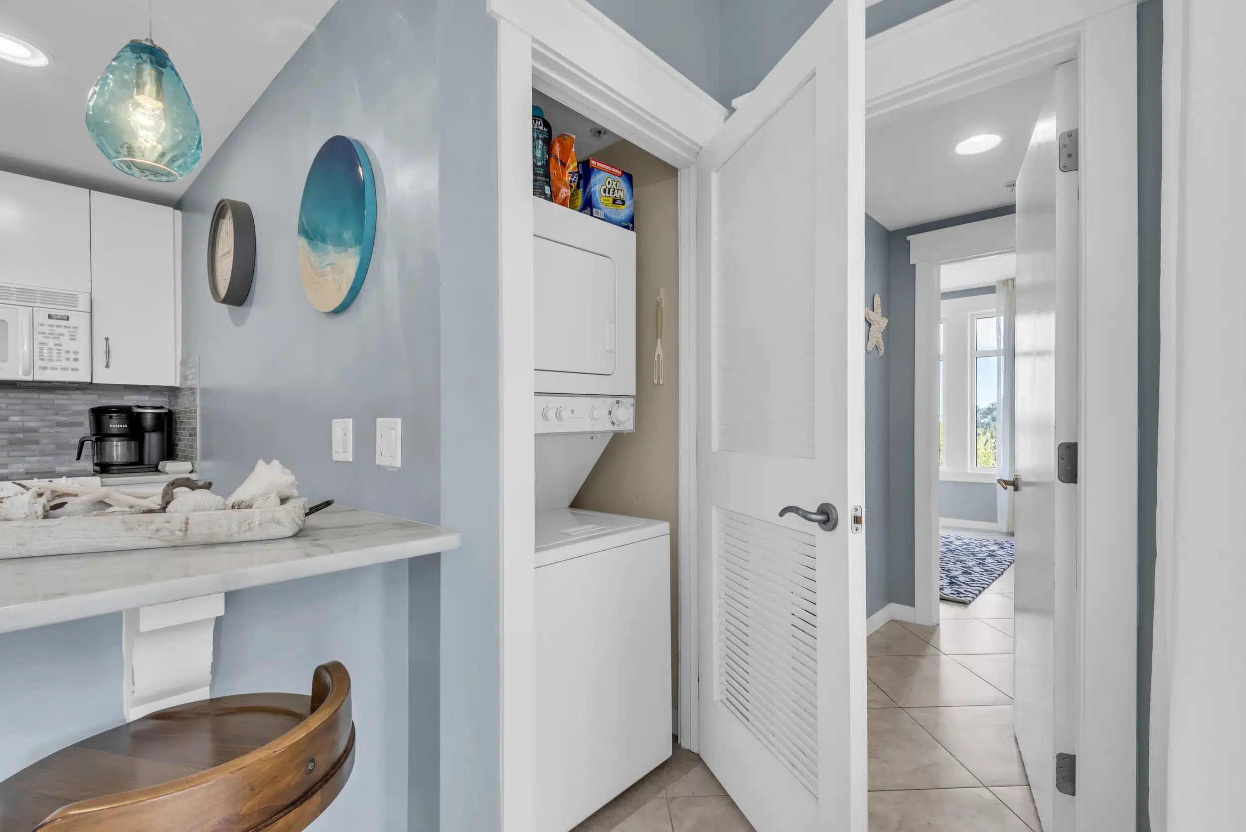 The SeaBlue condo in Elations is beautiful, bright, and classic— and bathed in sandy neutrals and calming blues that reflect the soothing coastal location. A comfy sofa— which is also a pull-out bed— and armchair face a large flatscreen television and create a perfect space to curl up with your favorite TV show or a great movie. Large windows allow the dappled Florida sunshine to pour in and frame the views of the swaying palm trees.