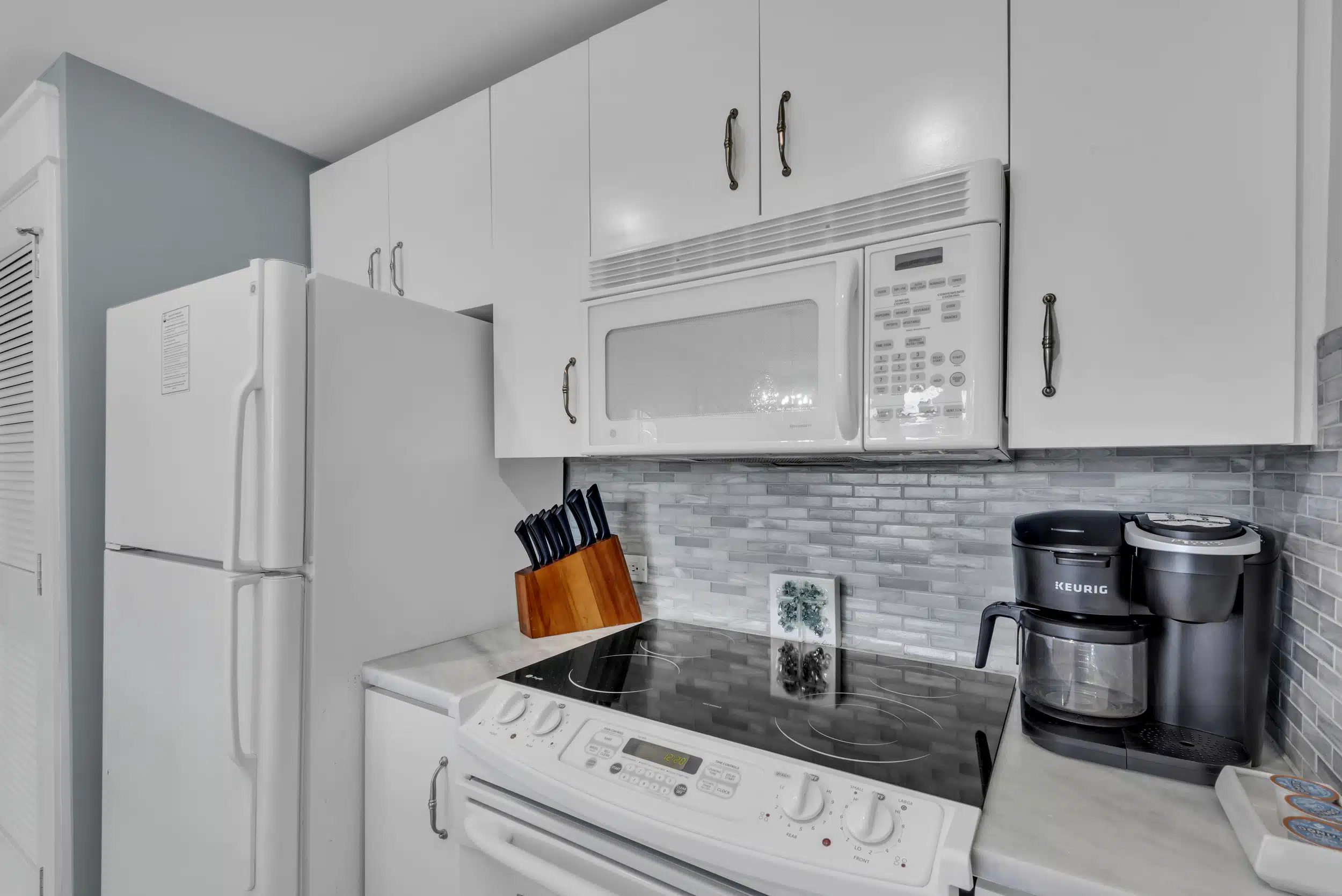 A rustic dining table with seating for four leads into the open kitchen. A peninsula bar has additional casual seating. Bright white cabinets, appliances, and quartz countertops create a luxe, pristine workspace that’s fully equipped to brew the morning coffee, pour some happy hour cocktails, or prepare a full dinner. Through a glass door is your sun-kissed private patio with comfy, plush lounge chairs.