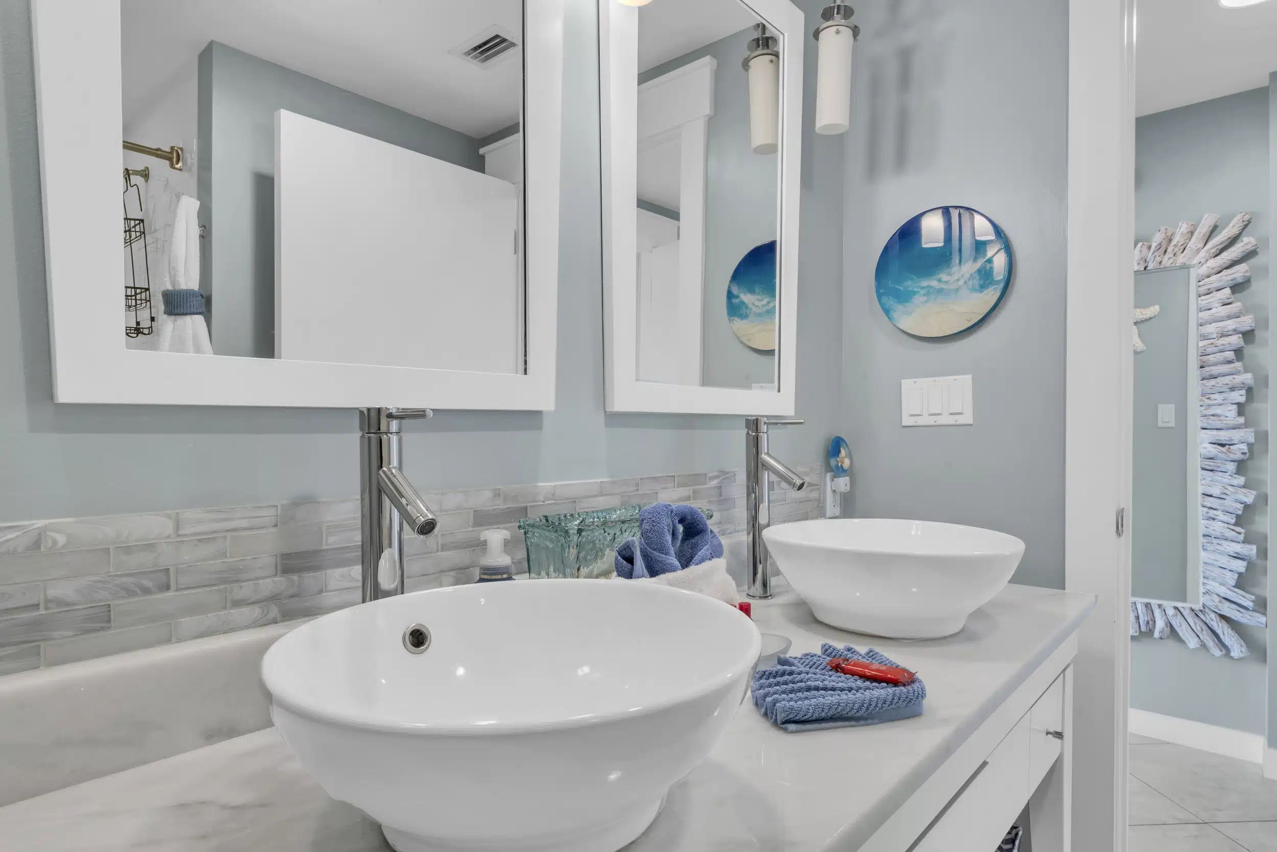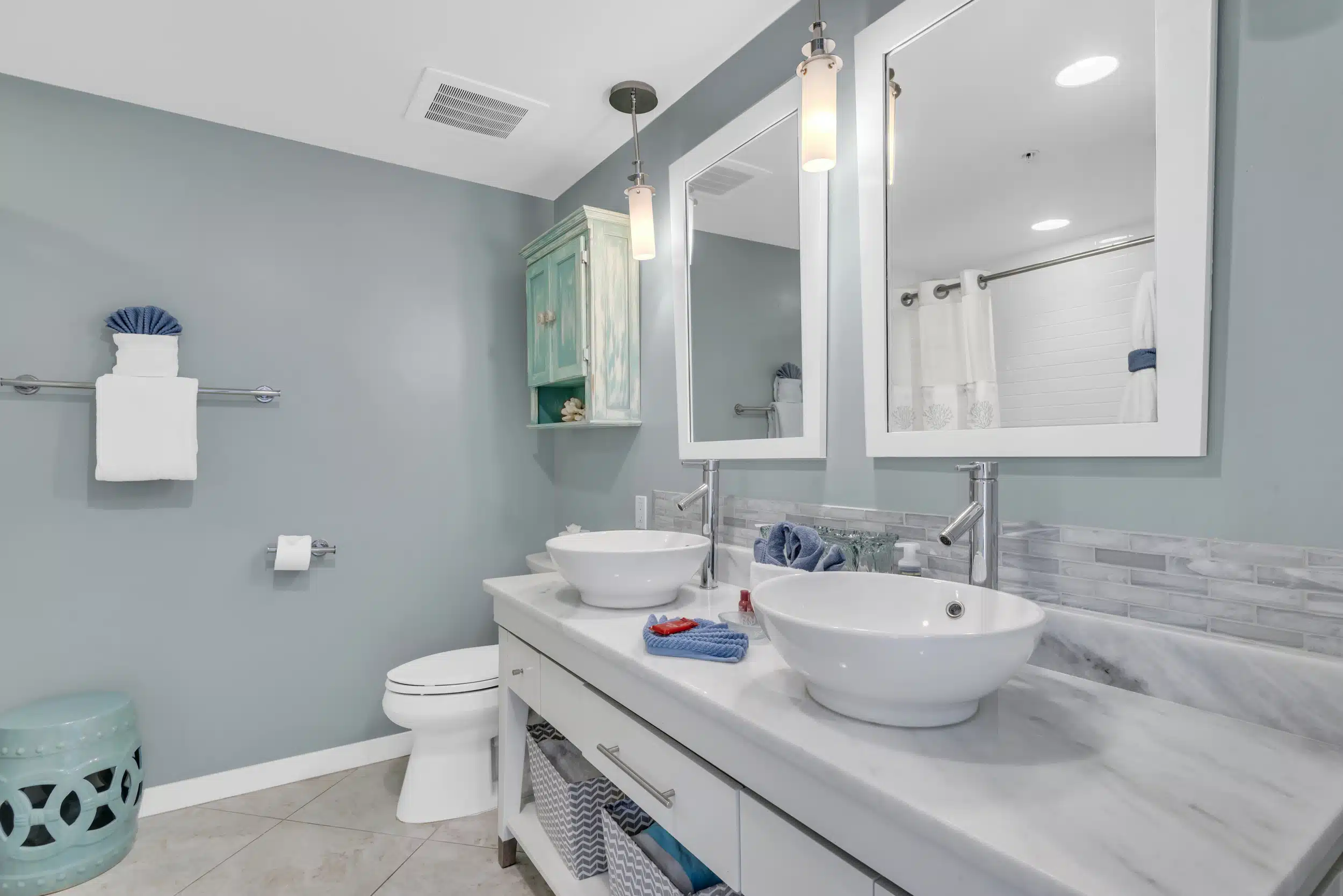 In the one bedroom, a luxe, king-size bed faces a flatscreen television while bright, natural light floods the room. There’s plenty of dresser space and closet space for unpacking. In the bathroom, there’s a tub/shower combo and a custom vanity with double vessel sinks. The condo also has a stackable washer and dryer.